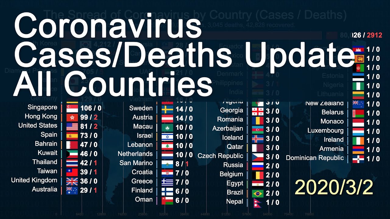 This bar chart contains the most up-to-date data about Coronavirus (COVID-10) cases and deaths. ALL COUNTRIES are displayed in the chart including United States, CHINA, SOUTH KOREA, ITALY, IRAN, JAPAN, FRANCE, GERMANY, SINGAPORE, HONG KONG, SPAIN, INDIA, Philippines, Malaysia, Pakistan, and all other countries that have confirmed cases. According to CVC, Coronavirus symptoms can include: